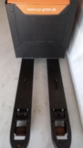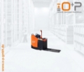 Plattform Kühlhaus, manuell hochklappbar; feste Seitenschutzwände mit kleiner Deichsel; Servolenkung, 8 km/h Version; Gleitschienen inkl. Kletterrolle; Gabelrollen Einfach, Stützrad doppelt; PIN-Code; Batterie Schnellverriegelung; blaues Warnlicht nach hinten gerichtet