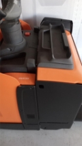 Plattform Kühlhaus, manuell hochklappbar; feste Seitenschutzwände mit kleiner Deichsel; Servolenkung, 8 km/h Version; Gleitschienen inkl. Kletterrolle; Gabelrollen Einfach, Stützrad doppelt; PIN-Code; Batterie Schnellverriegelung; blaues Warnlicht nach hinten gerichtet